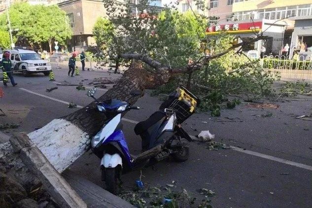就在這同一天,8級大風(fēng)刮倒了一棵樹,砸到了剛好路過的外賣小哥。