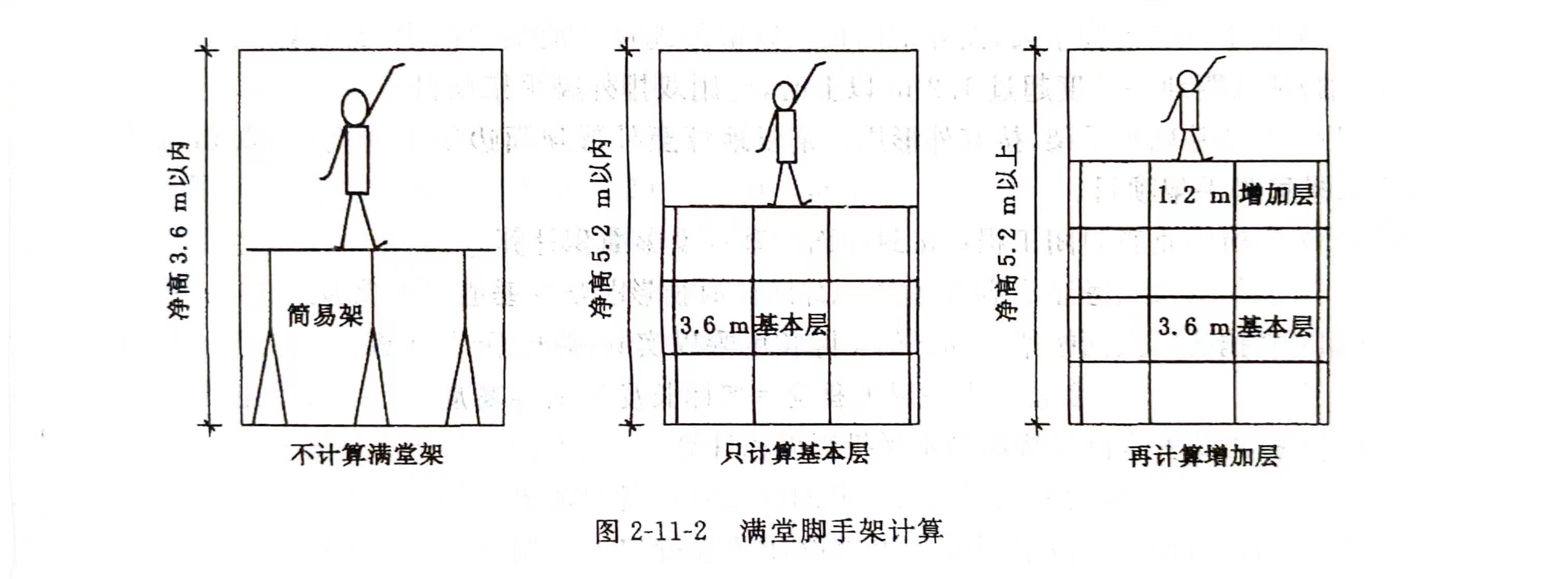 1.2m按增加一層計(jì)算,不足0.6m的不計(jì),滿堂腳手架工程量一室內(nèi)凈長度X室內(nèi)凈寬度再計(jì)算墻面裝飾腳手架,計(jì)算室內(nèi)凈面積時(shí),不扣除柱、垛所占面積。已計(jì)算滿堂腳手架后,室內(nèi)墻壁面裝飾不 室內(nèi)凈高超過3.6m時(shí),方可計(jì)算滿堂腳手架。室內(nèi)凈高超過5.2m時(shí),方可計(jì)算增加層,如圖2-11-2所示,增加層計(jì)算公式為:滿堂腳手架增加層一[室內(nèi)凈高度-5.2(m)]÷1.2(m)(計(jì)算結(jié)果0.5以內(nèi)舍去)